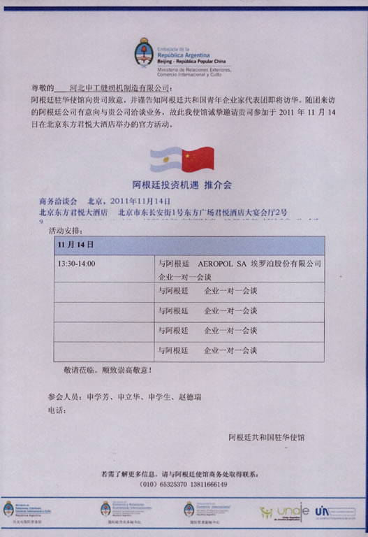 申工公司接受阿根廷駐中國(guó)大使館的邀請(qǐng),出席了11月14日在北京舉辦的官方活動(dòng)。并與阿根廷共和國(guó)青年企業(yè)家代表團(tuán)中的(AEROPOL SA )埃羅泊股份有限公司進(jìn)行了一對(duì)一的會(huì)談。