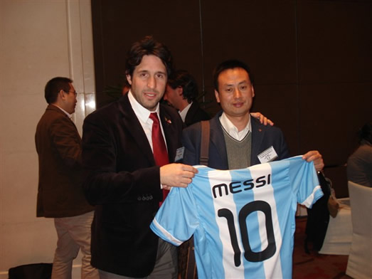 會(huì)談后埃羅泊股份有限公司的總經(jīng)理向我方贈(zèng)送了阿根廷國(guó)家足球隊(duì)著名球星梅西的10號(hào)球衣。
